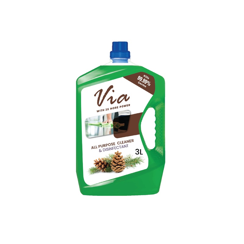 Via All Purpose Cleaner & Sanitizer Pine 3L Via Disinfectant and active cleaner for household surfaces ,kitchens ,toilets ,bathrooms and all indoor and outdoor use ,adds luster with long lasting refreshing ftagrances.