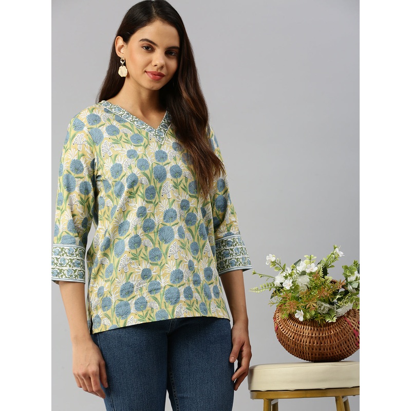 Design: All Over PrintedMaterial: CottonFit: RegularFeatures: V neck with 3/4thSleeveLength: Short and stylishStyle: Versatile for both casual and semi-formal settings.Elevate your ethnic wardrobe with our De Moza Women Printed Short Kurti Lemon Yellow. A