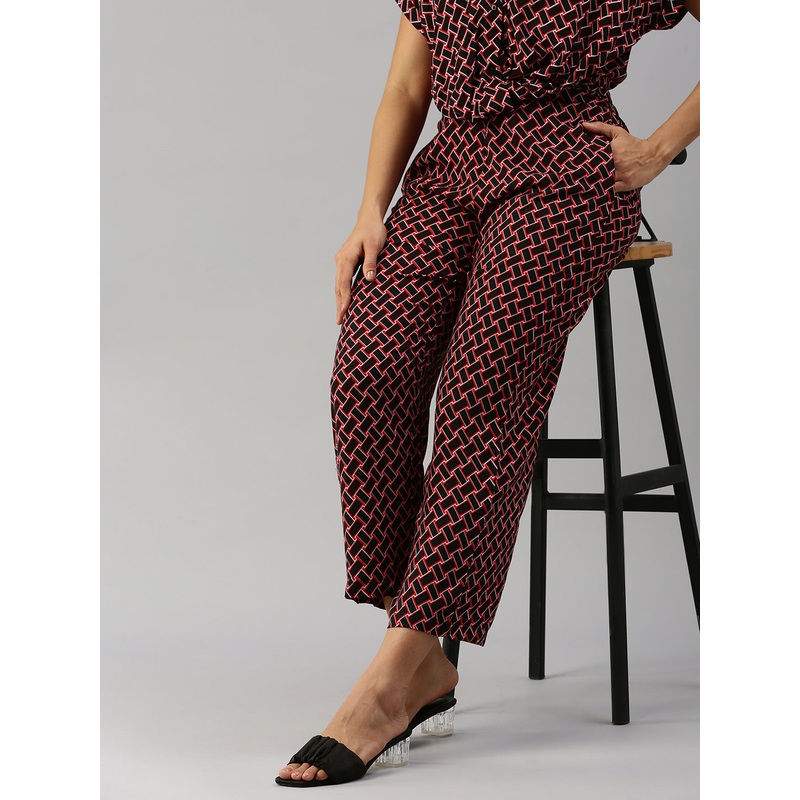 Design: All Over Print Fit: Regular Fit Color: Black & Red Material: Rayon Closure: Elastic Waistband Features: Mid Rise with 2 Side Pockets Elevate your daily fashion with our De Moza Women Printed Straight Pants in Black & Red. Available in a range of cl