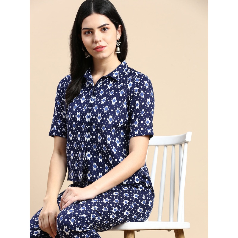 Design: All Over PrintFit: Regular FitMaterial: 100% CottonType: Woven TopNeck : Collared NeckFeatures: Half Sleeves Discover the perfect blend of comfort and fashion with De Moza Women Printed Top Indigo. Our collection is designed to make you look and fe