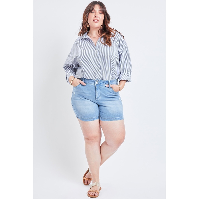 Vintage style with a modern-twist! Our Women Plus Size Basic 2-Button Side Slit Hem Shorts are perfect for the woman who loves the classic look, but wants to add a little edge. Detailed with light front-distressing, whiskering, and an exposed 2-button fly with zipper for the vintage look, but made amazingly comfortable with plenty of stretch and recovery. Made with a high-rise that sits right below the belly button for a flattering fit and side slits for easy movement. We love these shorts styled with a tucked in blouse to show off trendy details, and a strappy or braided sandal to finish off the look!