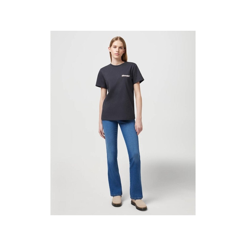 Wrangler Body Bespoke Women's Dark Blue Bootcut Camellia Jeans Medium blue jeans in the popular Bootcut cut - higher sitting position and slightly flared legs from the knees. Jeans with a zipper. They stand out with their perfect blue color and details. Yo