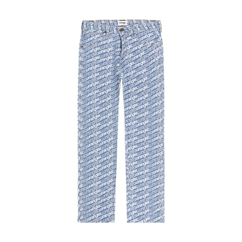 Wrangler Men's Blue & White Frontier 880 Relaxed Straight Jeans The jeans feature a unique all-over print design with the "Wrangler" logo repeated in a diagonal pattern across the entire garment. The base color is a light blue, and the logos are in a contr